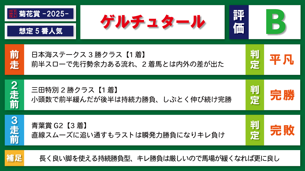 【前走】少頭数、前半スロー、後半瞬発力勝負とこの馬の得意条件全てに完璧にハマって完勝と言う内容でした、本番を見据えた仕上げでこのパフォーマンスは評価したいと思います。