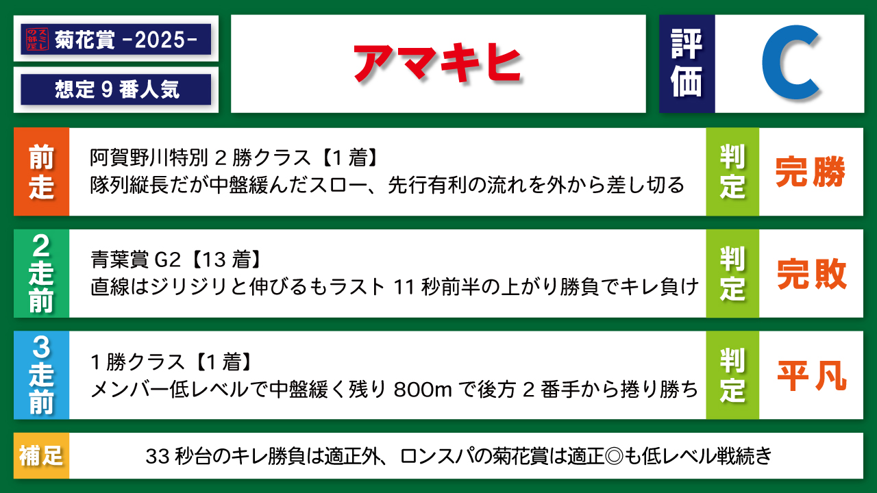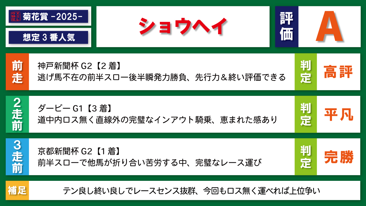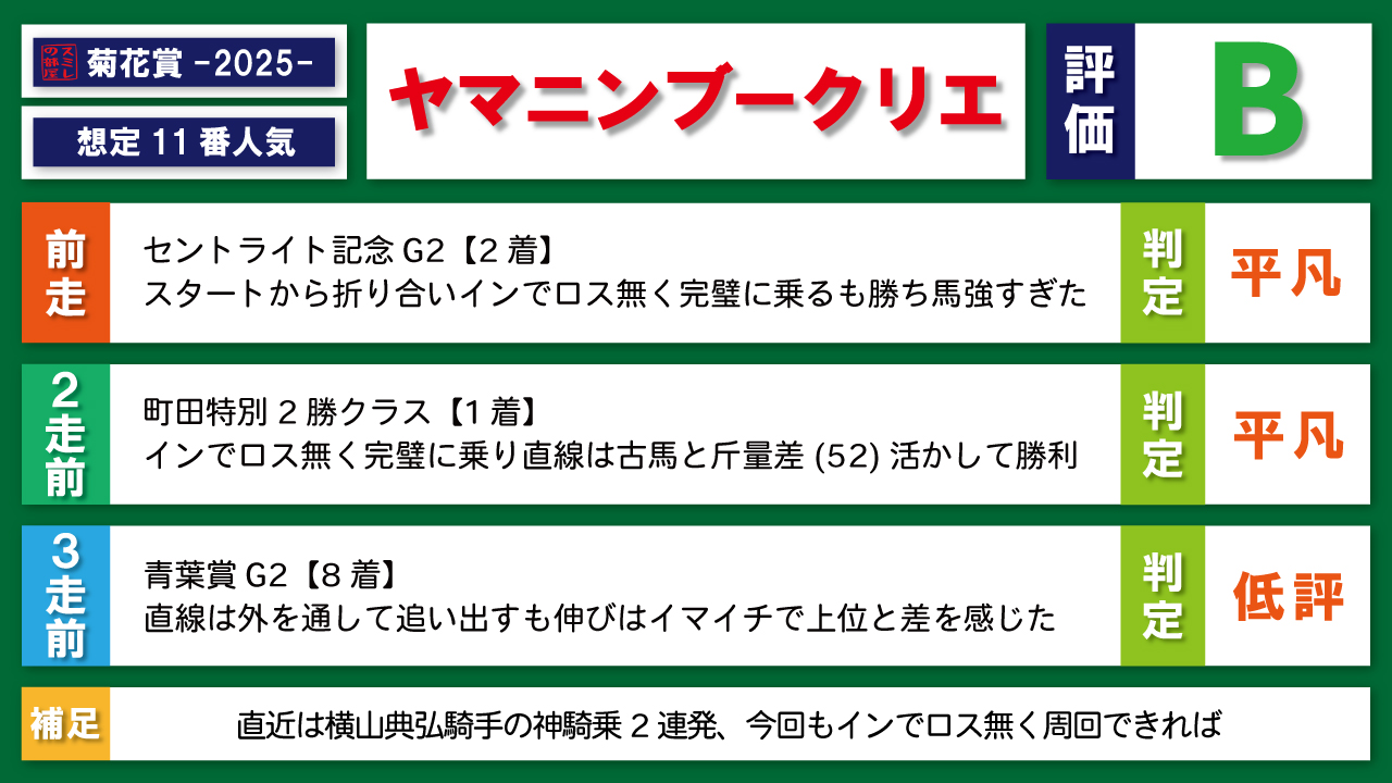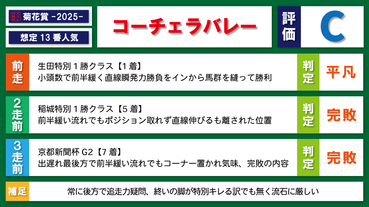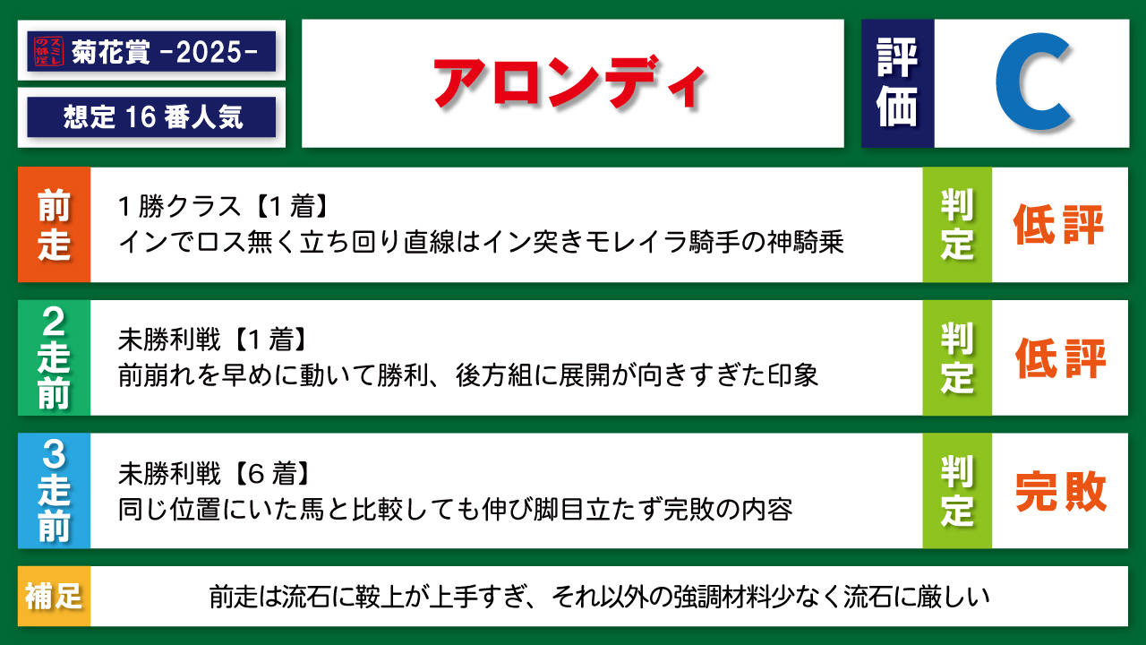 【前走】スローの流れを道中インでロス無く脚を溜め直線は外に出す完璧な立ち回りで勝利、出走メンバーも弱く少頭数であまり評価はできません。