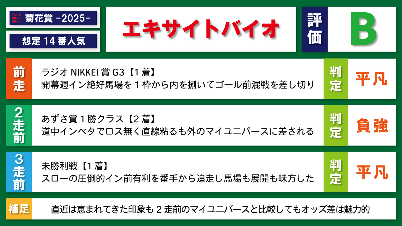 個人的には4ハロン目から速いLAP刻んでますし、勝ち時計的にも負けはしましたが評価したいのはマイユニバースよりもエキサイトバイオなので負強(負けて強い)評価です。