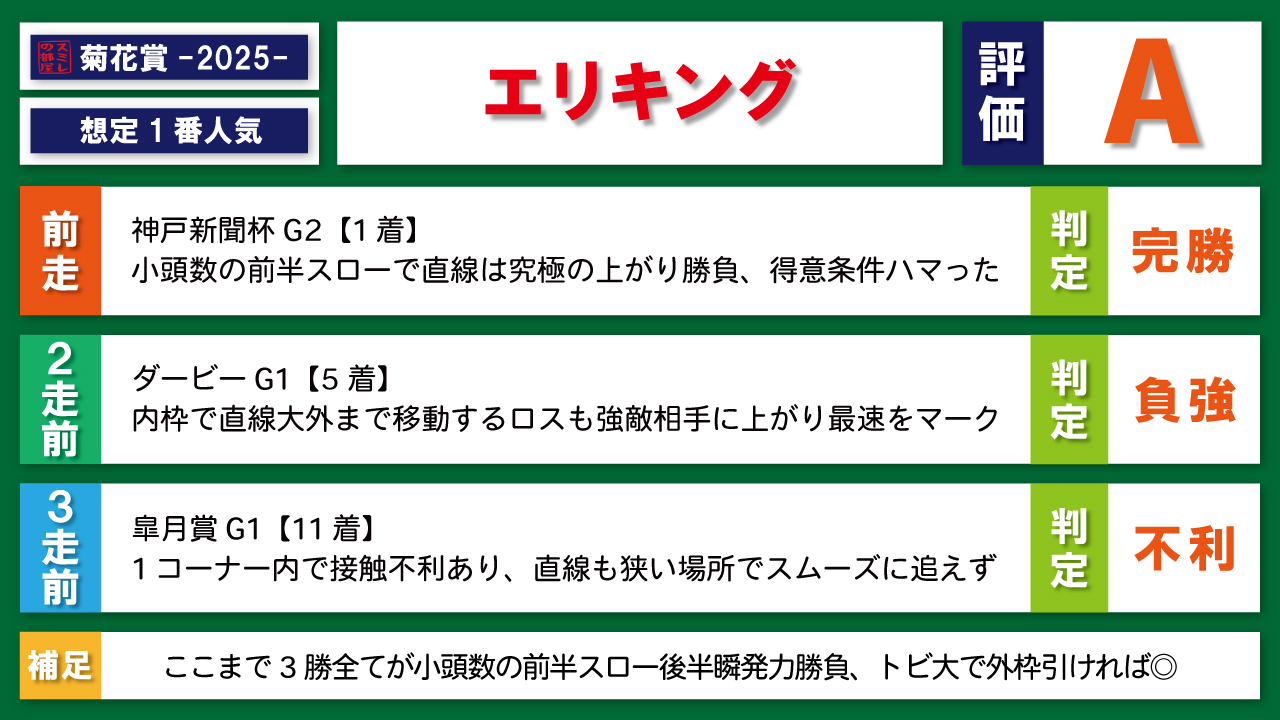 【補足】ここまで3勝していますが、その全てが少頭数、前半スロー、後半瞬発力勝負の3つの条件が揃った時で、トビが大きい馬なので枠順も非常に大切になってくるかなと思います。