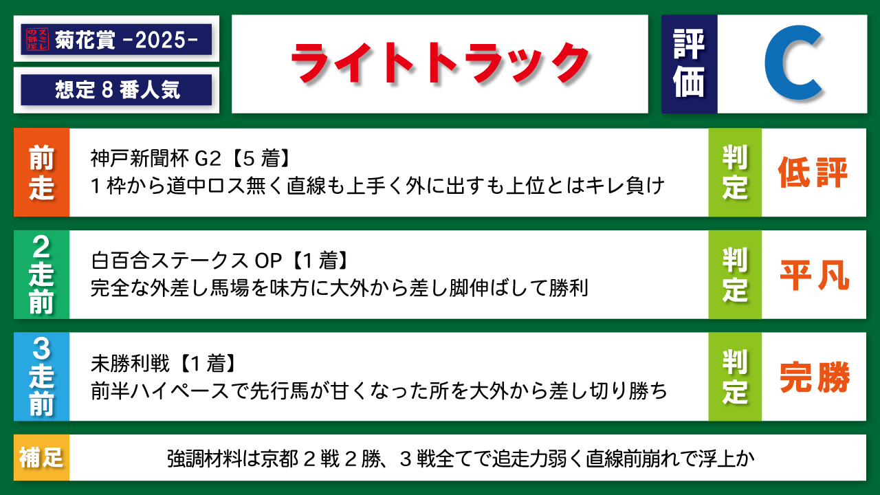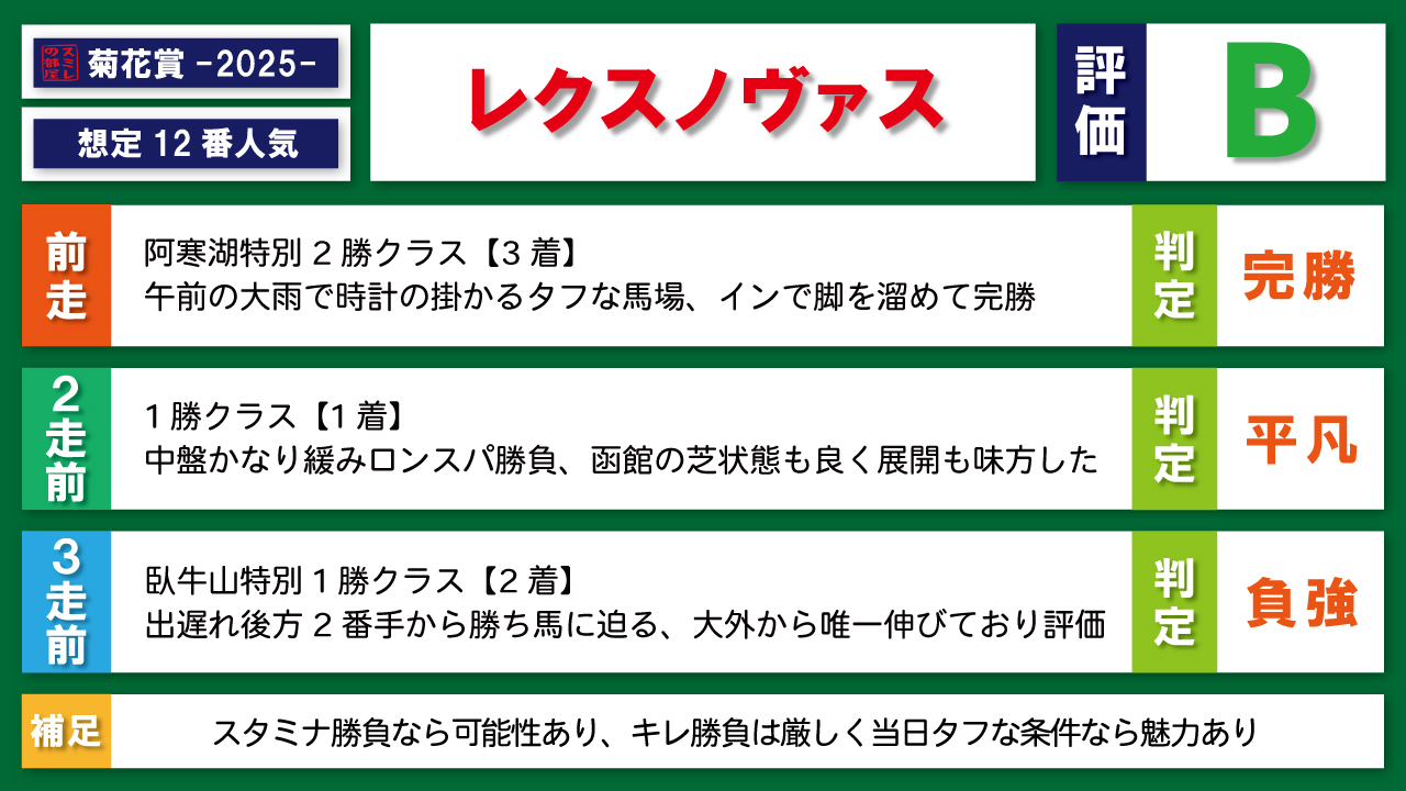 【2走前】直前の雨で時計平凡ですけれども、中盤緩んで前も余力がある中で大外から加速LAP差し切りと非常に内容の濃いレースで評価は高めです。