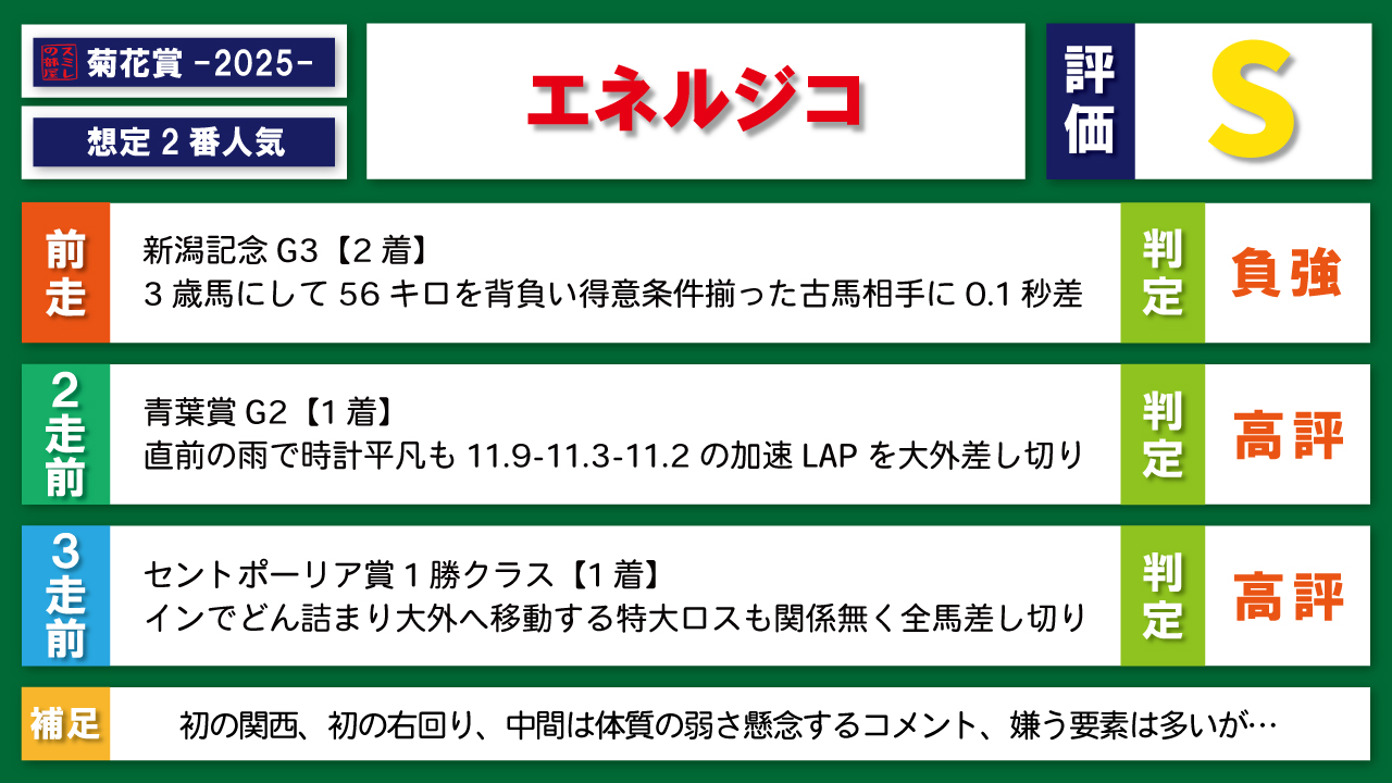 【前走】スタートからロス無く完璧なレース運びでしたが流石に勝ち馬が強すぎたので評価としては平行線といったところです。