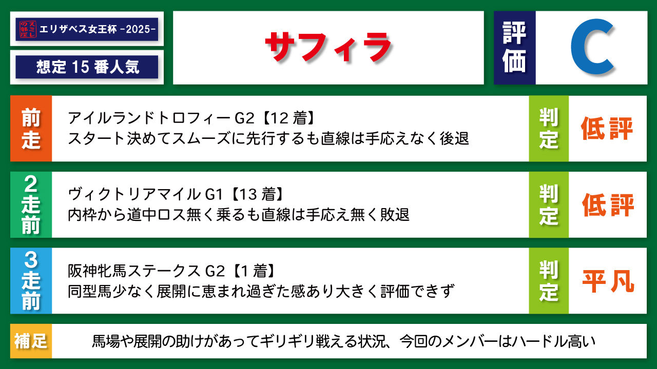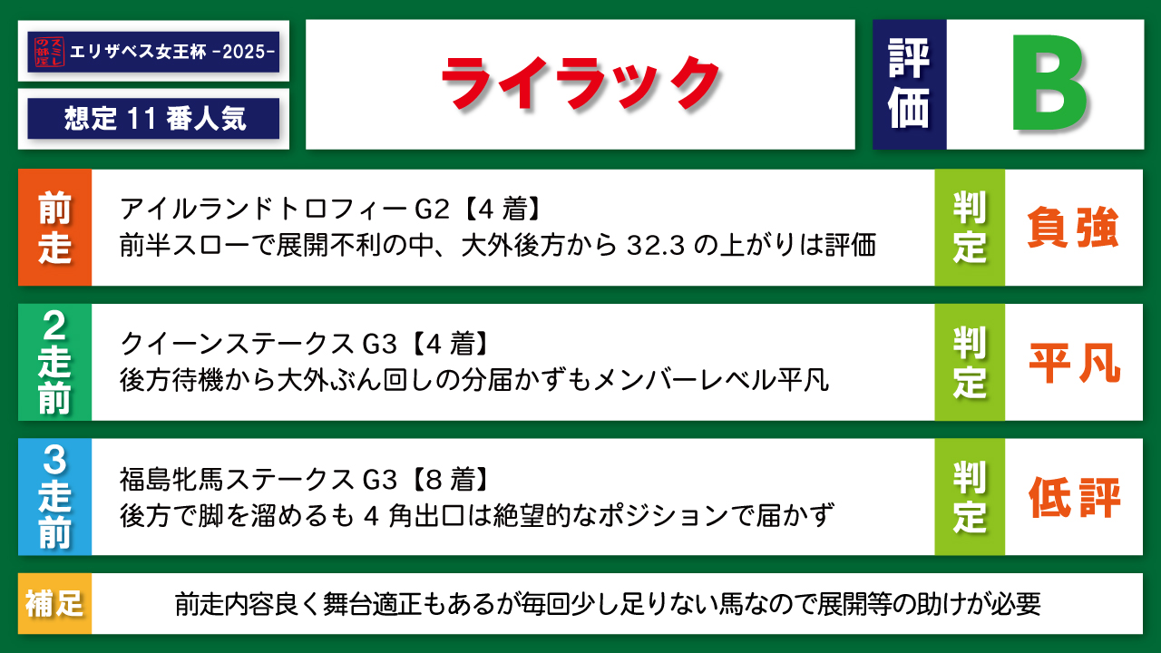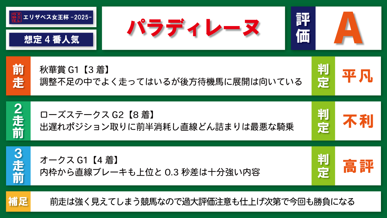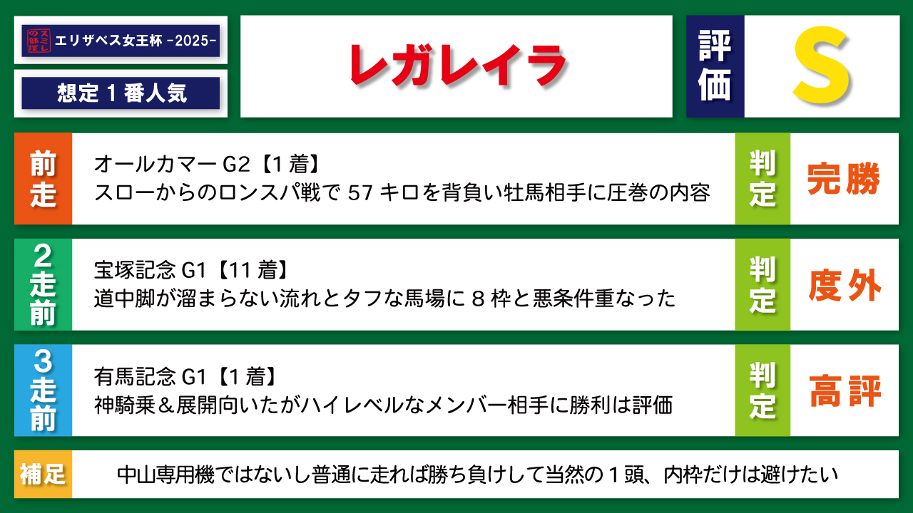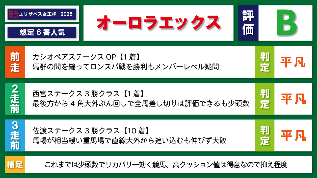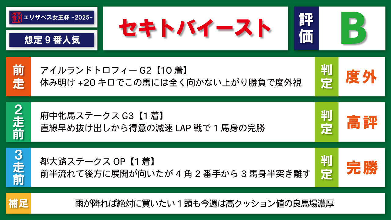 【メモ】末脚は当然ながらこの馬の武器ではありますが、エリザベス女王杯は33秒の脚は必要ないレースで、直近のメンバーレベルを見ても多少は疑う余地あるかなと思います。この馬が当日レガレイラに続く抜けた2番人気だと思うので、レガレイラを評価したい身としては馬券的なりターンを考えると今回はB評価までとさせていただきます。