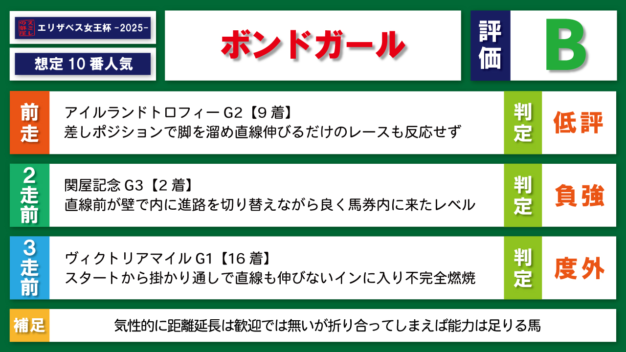 【2走前】外枠から馬場の綺麗な場所を選んでスムーズに追い通し勝利、メンバー中3番目に軽い斤量を背負っていたので、不利もありながら2キロ思いボンドガールの方が強い競馬をしていたと思うので重賞勝ちは素晴らしいですが大きく評価は出来ないので平行線です。