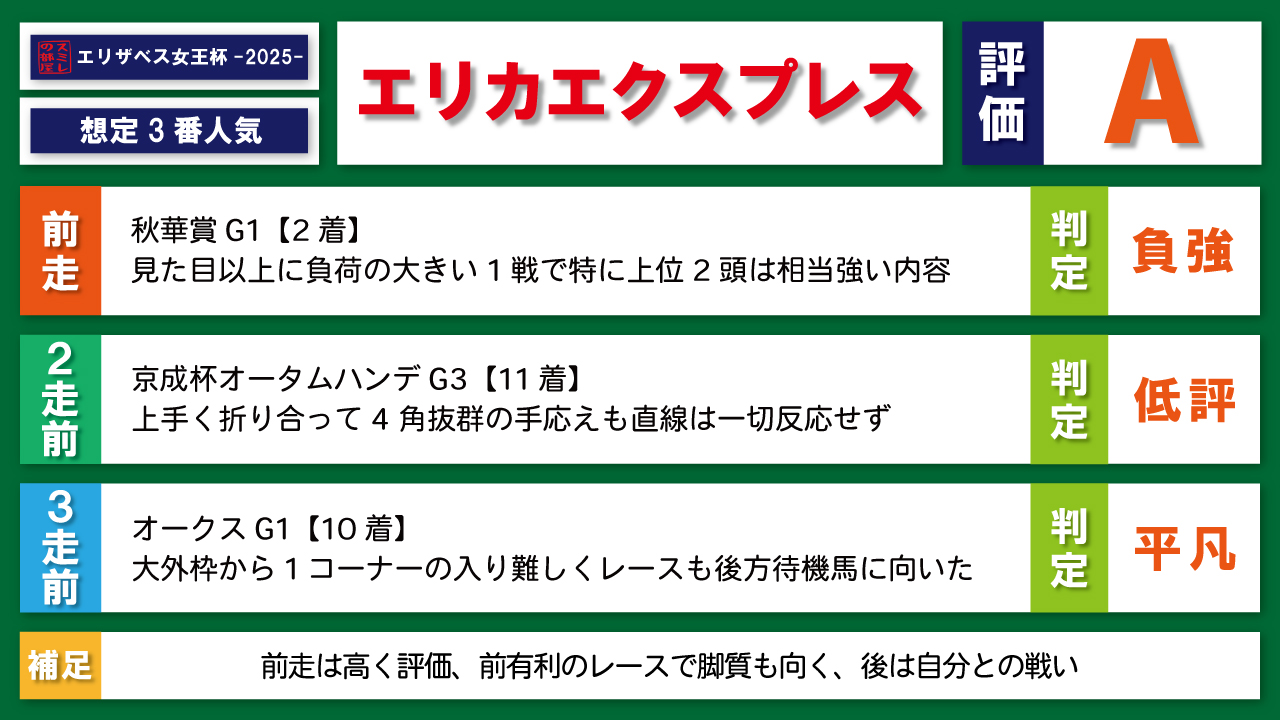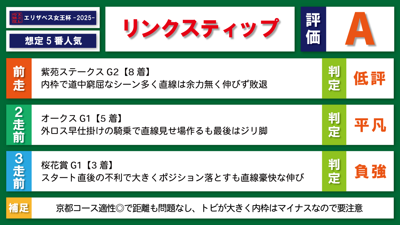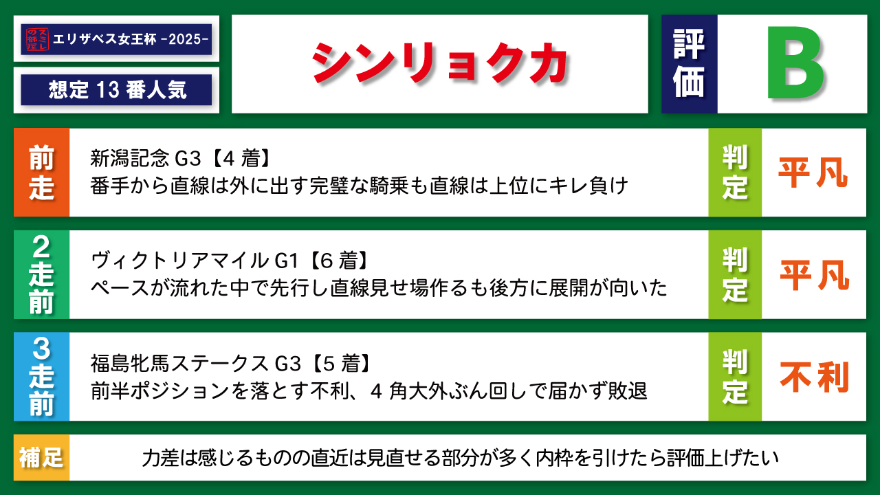 【メモ】戦ってきたメンバーを考えれば普通に走れば勝ち負けして当然の1頭で、中山専用機と言われていますが全くそんな事はありません。この馬が好走するには道中脚が溜まる流れ、コーナーから徐々に加速する流れ、この2点が揃う事です。エリザベス女王杯の舞台はかなり向いていると思うので当然のS評価で良いと思います。