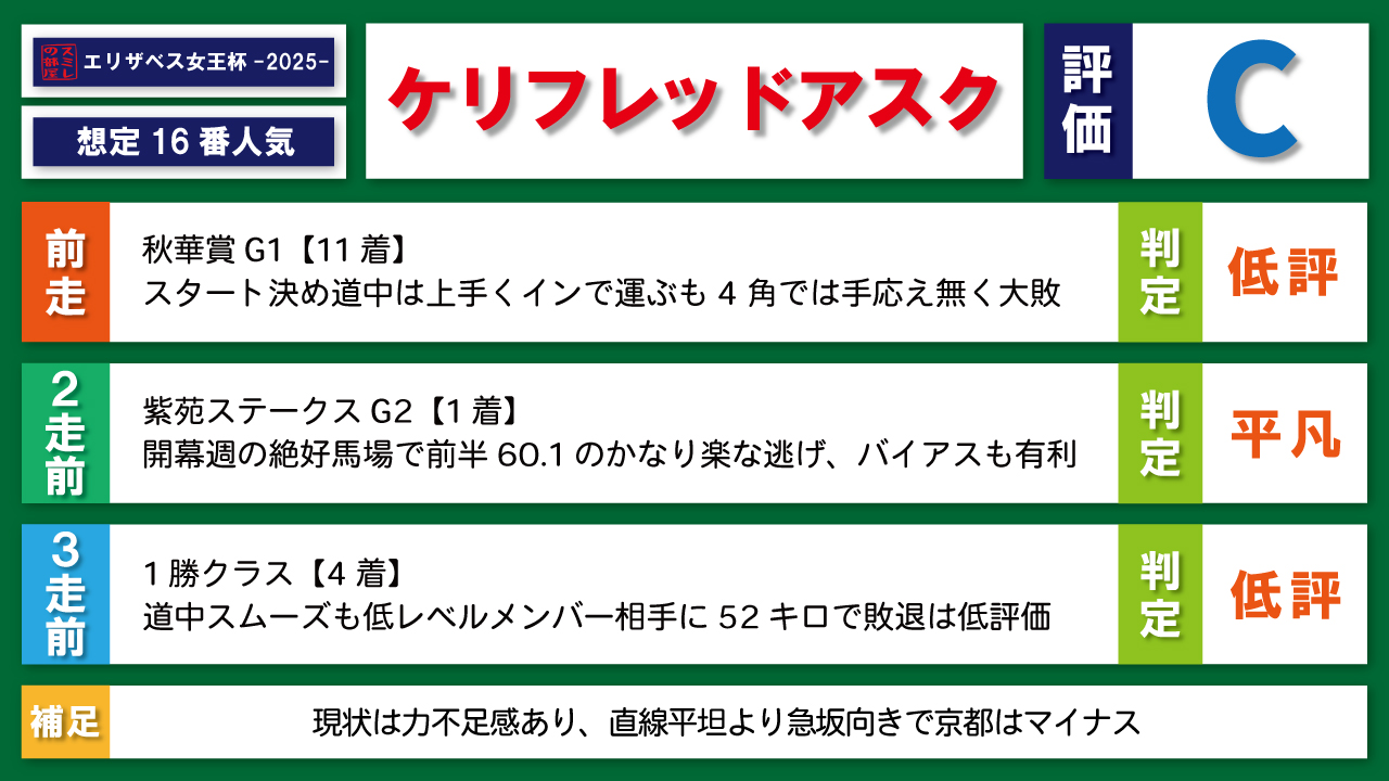 【メモ】平坦巧者なので京都コース替わりは魅力ですが、直近のメンバーレベル疑問でここはハードルが高いと思うのでC評価とさせていただきました。