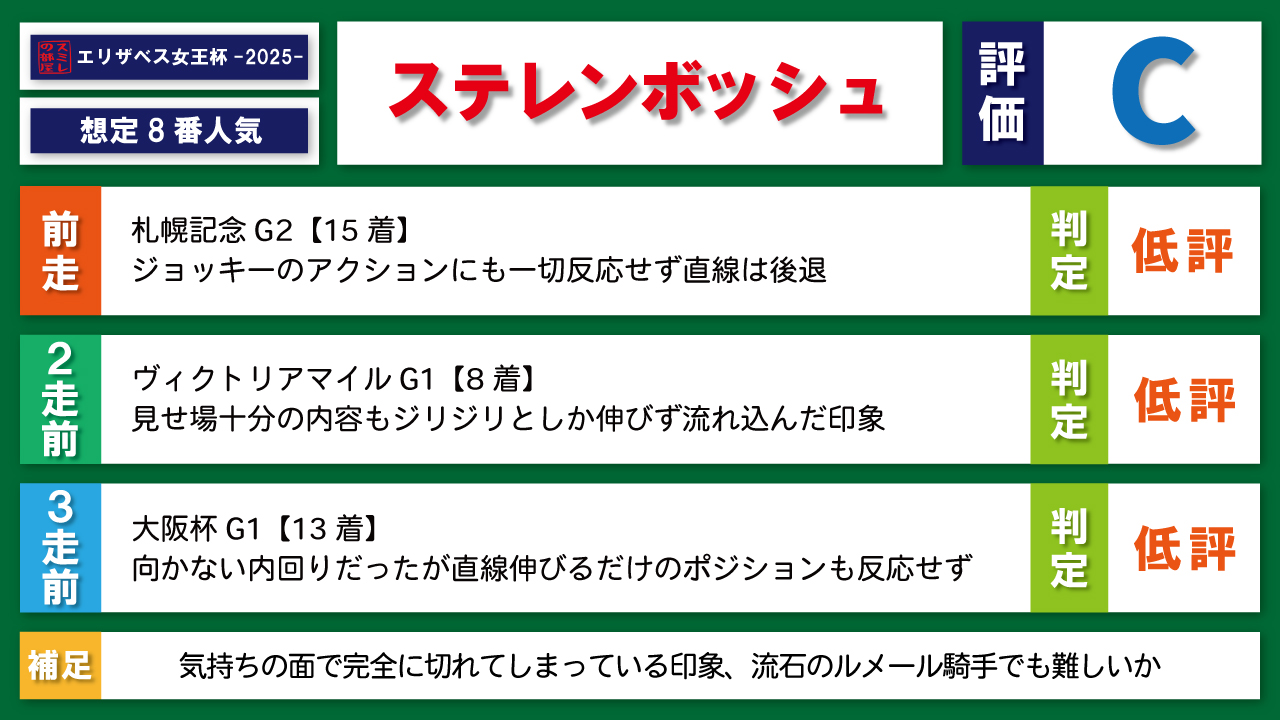 【メモ】去年の香港ヴァーズから帰国後、馬が入れ替わったのかと思うほど走らなくなってしまった印象で、流石のルメール騎手でも難しいと思うのでC評価とさせていただきました。