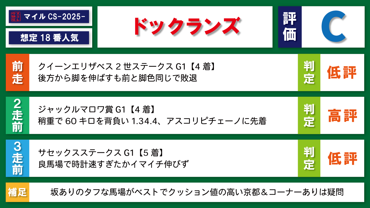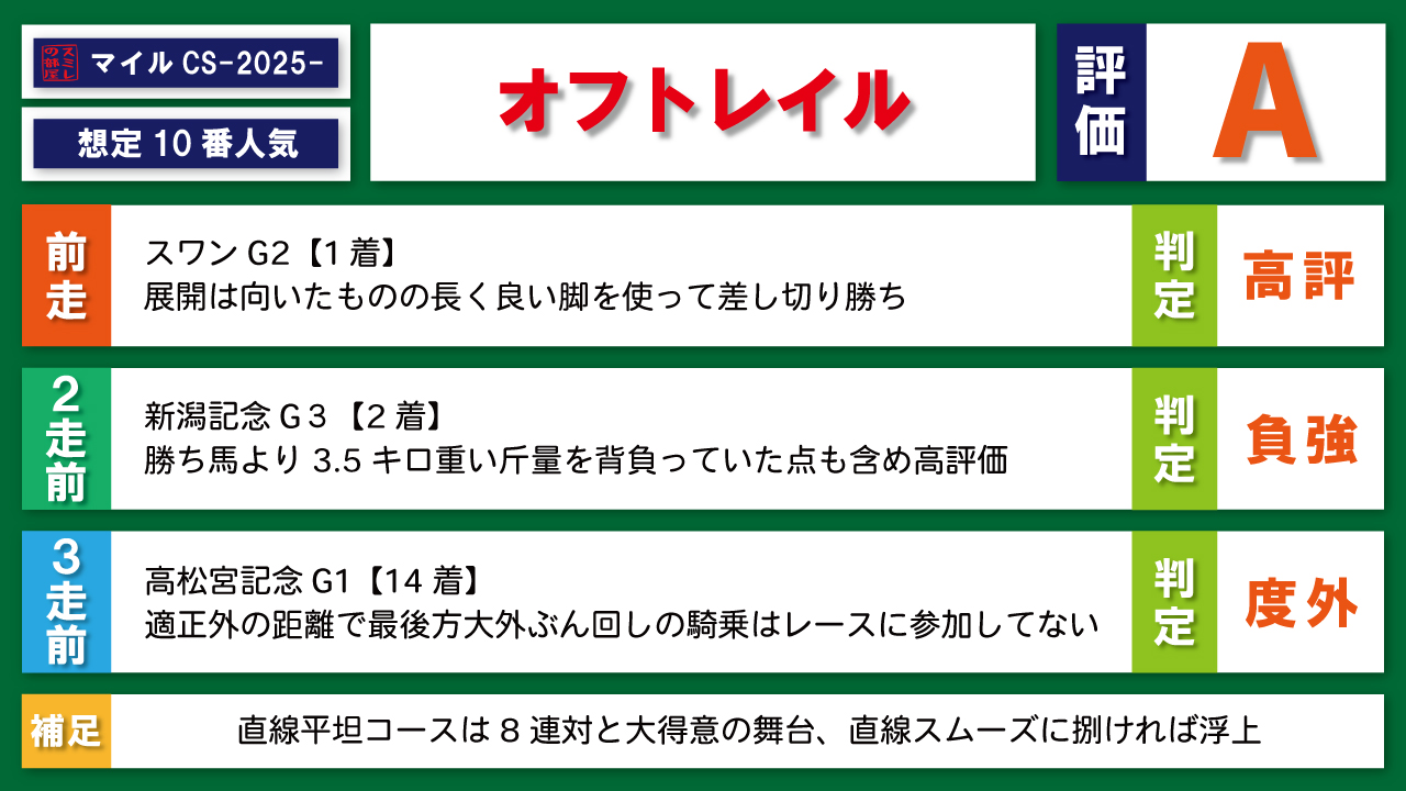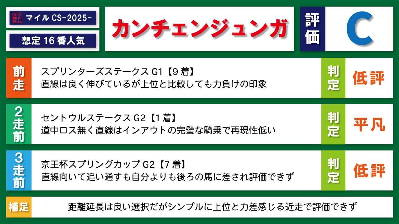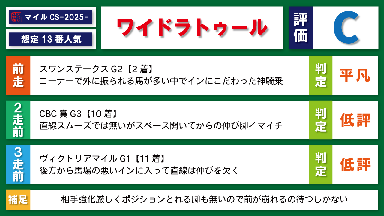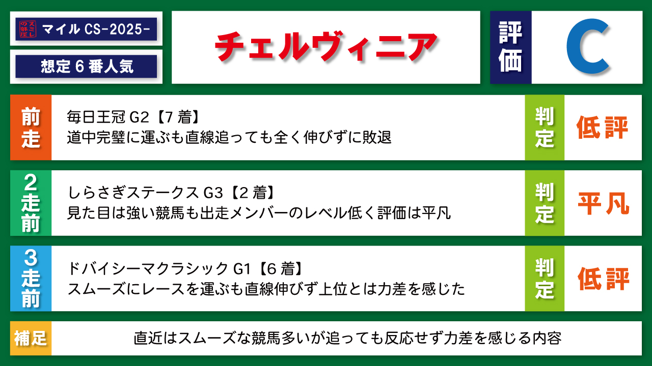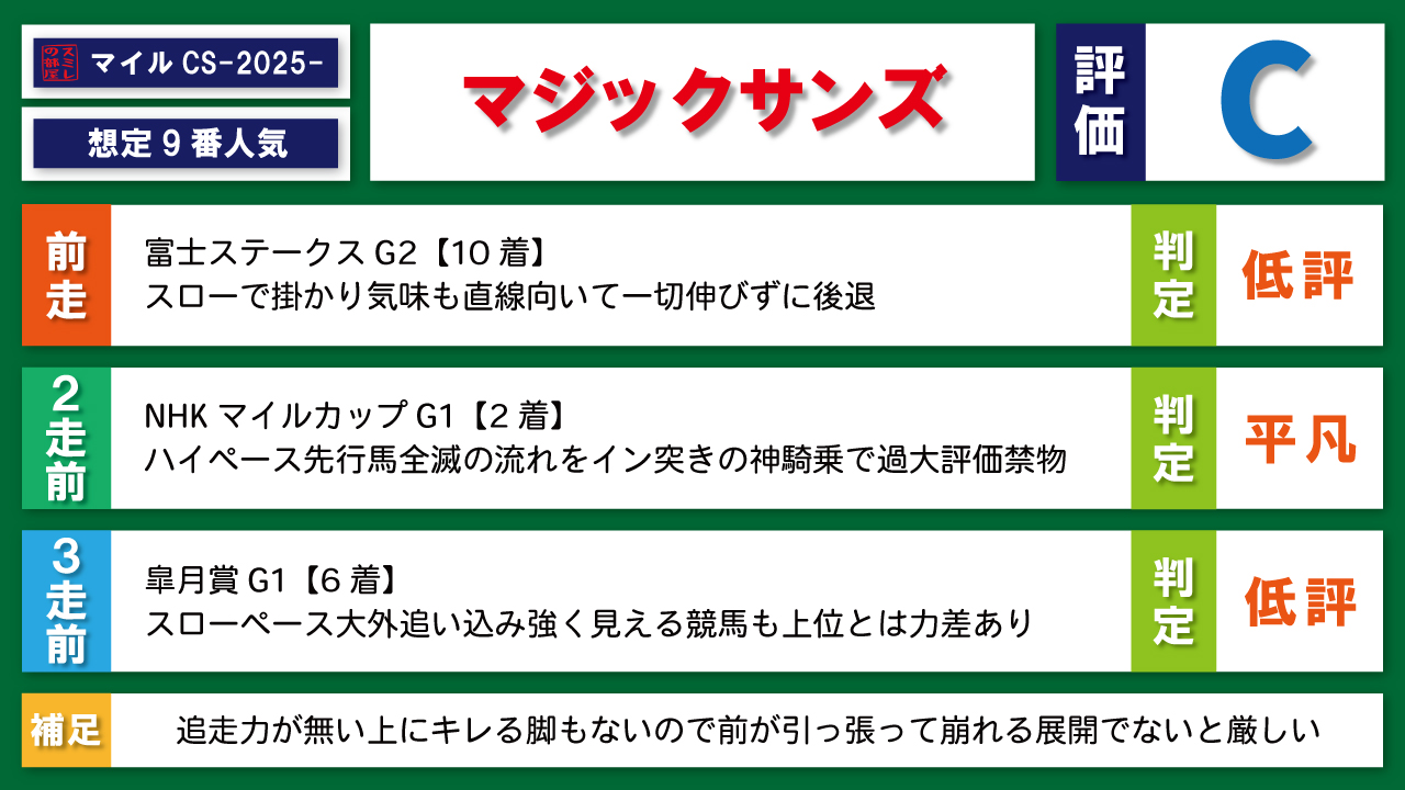【メモ】追走力が無い上に特別キレる脚もないので馬券内に入るのであれば先行馬全滅の展開の助けが必要でここはC評価
