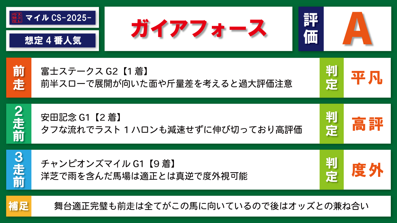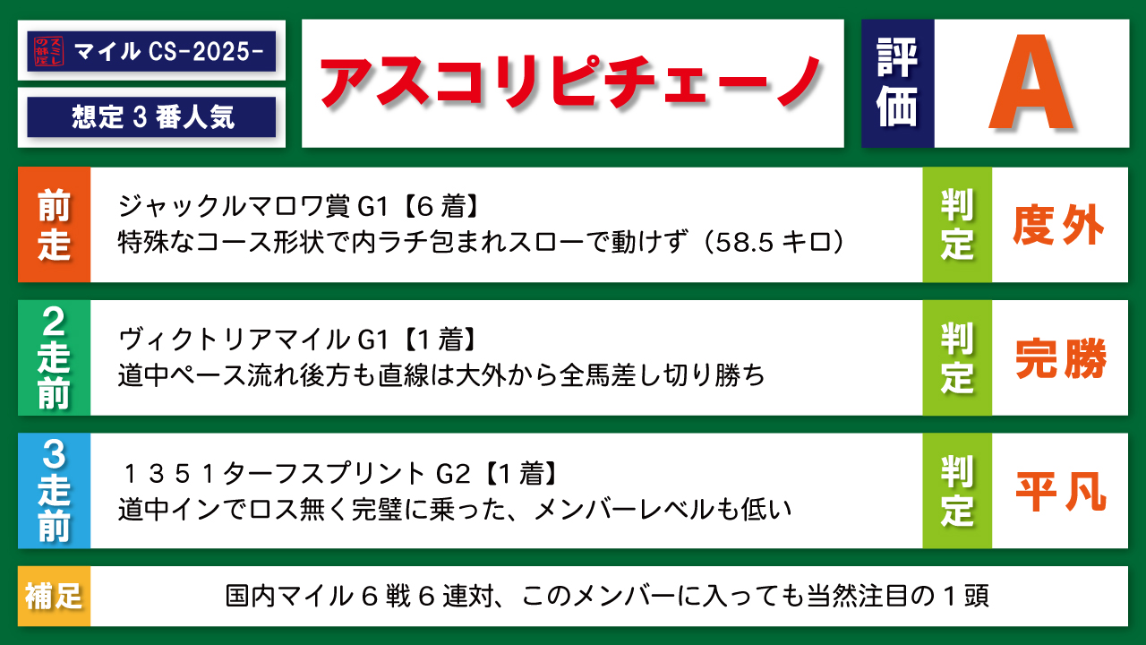 ここまでの馬場になれば時計勝負に滅法強いアスコリピチェーノも間に入る隙間があり、毎年波乱傾向のマイルチャンピオンシップだが今年は特に上位人気が明確に信頼の置ける存在だと感じます。